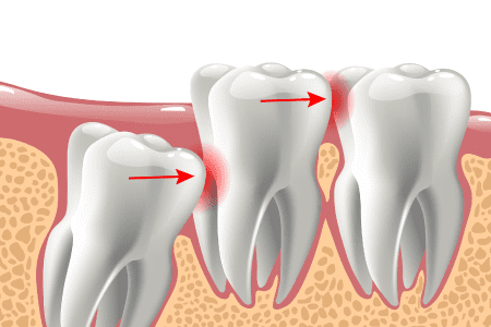 親知らずはまれに、隣の歯を圧迫するような生え方で成長することがあります。